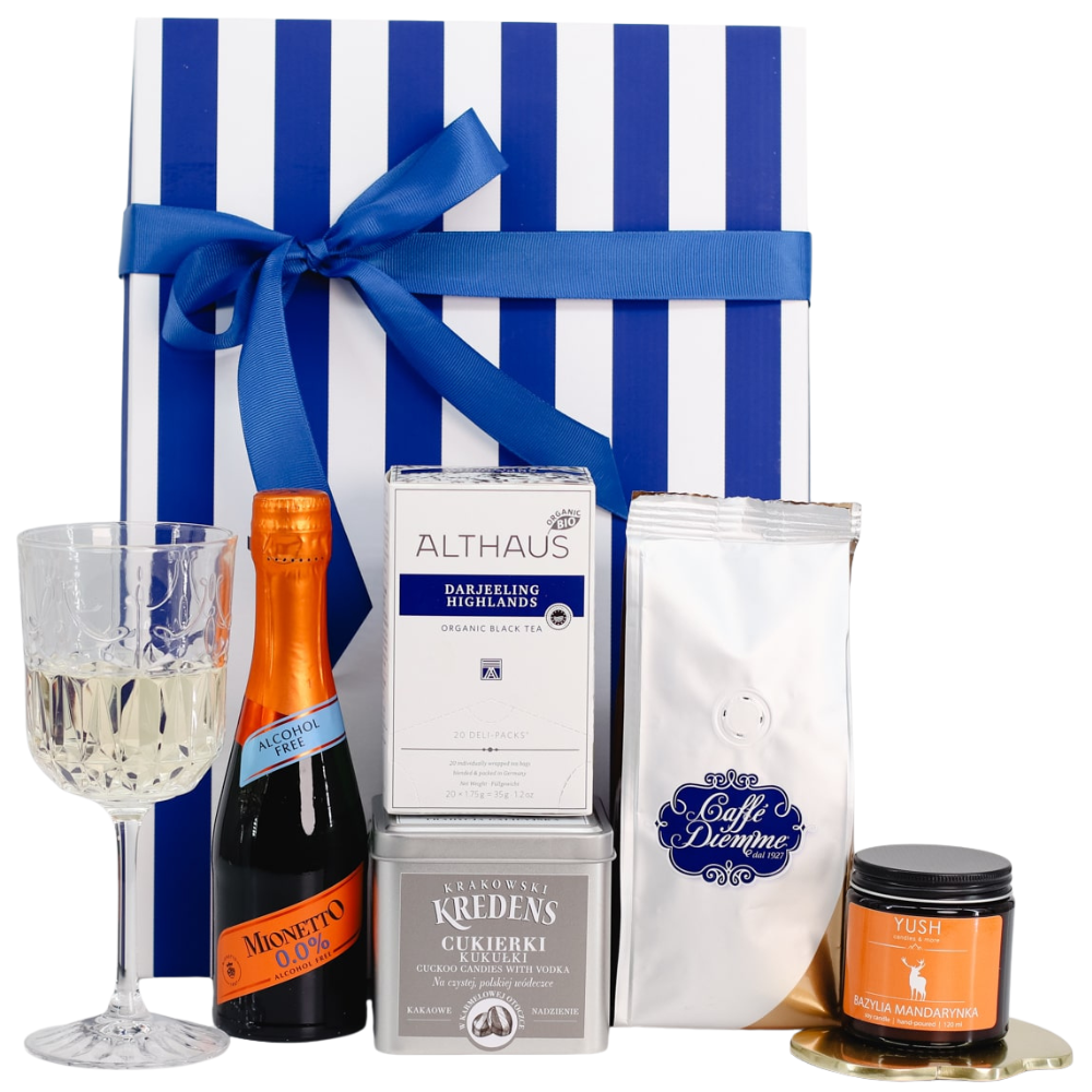 Wyjątkowy zestaw upominkowy z bezalkoholowym Prosecco Mionetto, szlachetną herbatą Darjeeling Highlands, aromatyczną kawą Diemme Blu, kultowymi kukułkami w puszce Krakowski Kredens oraz sojową świecą o zapachu bazylii i mandarynki. Eleganckie opakowanie sprawia, że to idealny prezent na każdą okazję.