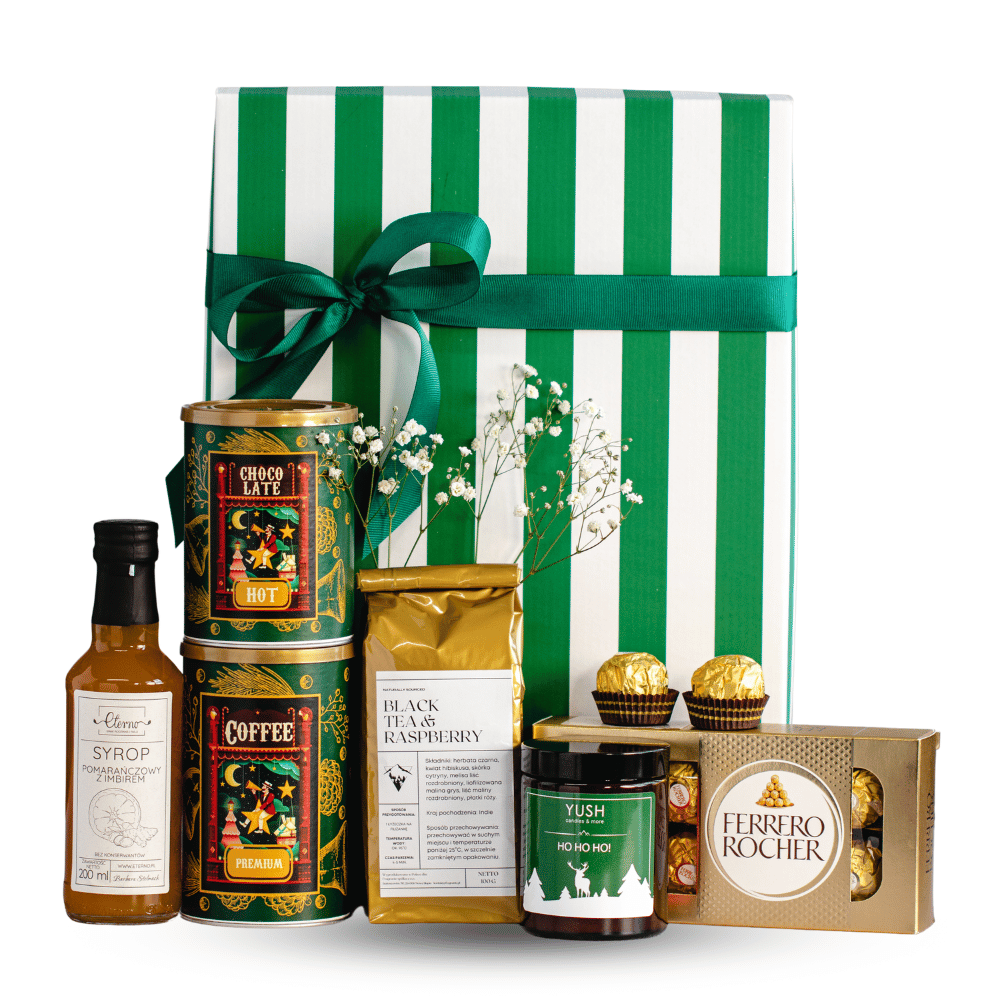 Luksusowy zestaw prezentowy z syropem cynamonowo-karmelowym, aromatyczną herbatą w puszce, wyśmienitą kawą w puszce, relaksującą herbatą, pralinami Ferrero Rocher oraz sojową świecą o zapachu Ho Ho Ho. Zapakowany w elegancki kartonik z ozdobną wstążką, doskonały na każdą wyjątkową okazję.