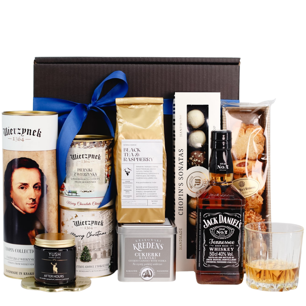 Bogaty zestaw prezentowy z whisky Jack Daniel’s, relaksującą herbatą liściastą, sojową świecą After Hours, mieszanką ciastek i pierników w czekoladzie, piernikami i krążkami czekoladowymi Wierzynek, kruchymi ciasteczkami z Krakowa, kultowymi kukułkami w puszce oraz truflami Sonaty Chopina. Idealny na wyjątkowe chwile.