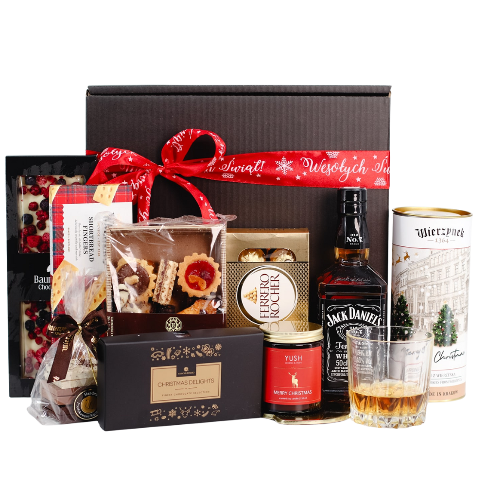 Świąteczny zestaw prezentowy z whisky Jack Daniel’s, białą czekoladą z owocami, sojową świecą Merry Christmas, pralinkami Ferrero Rocher i Chocolissimo, maślanymi paluszkami, piernikami Wierzynek, miksem czekolad z kawą oraz mieszanką ciasteczek z Krakowa. Elegancki upominek na wyjątkowe chwile.
