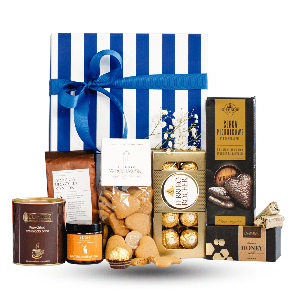 Elegancki zestaw prezentowy z mleczną czekoladą pitną z truskawkami, piernikowymi sercami leżakującymi w whiskey, klasycznymi piernikami, naturalną kawą Brazylia Santos oraz pralinami Ferrero Rocher. Dopełniony sojową świecą o zapachu bazylii i mandarynki. Zapakowany w kartonik z ozdobną wstążką, idealny na każdą wyjątkową okazję.