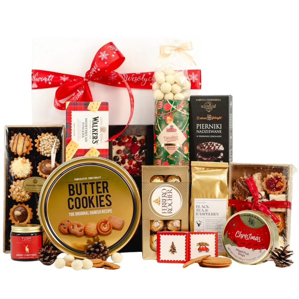 W zestawie znajdziesz: Herbata, Świeca, Czekolada, Ciastka, Bakalie, Praliny i Cukierki