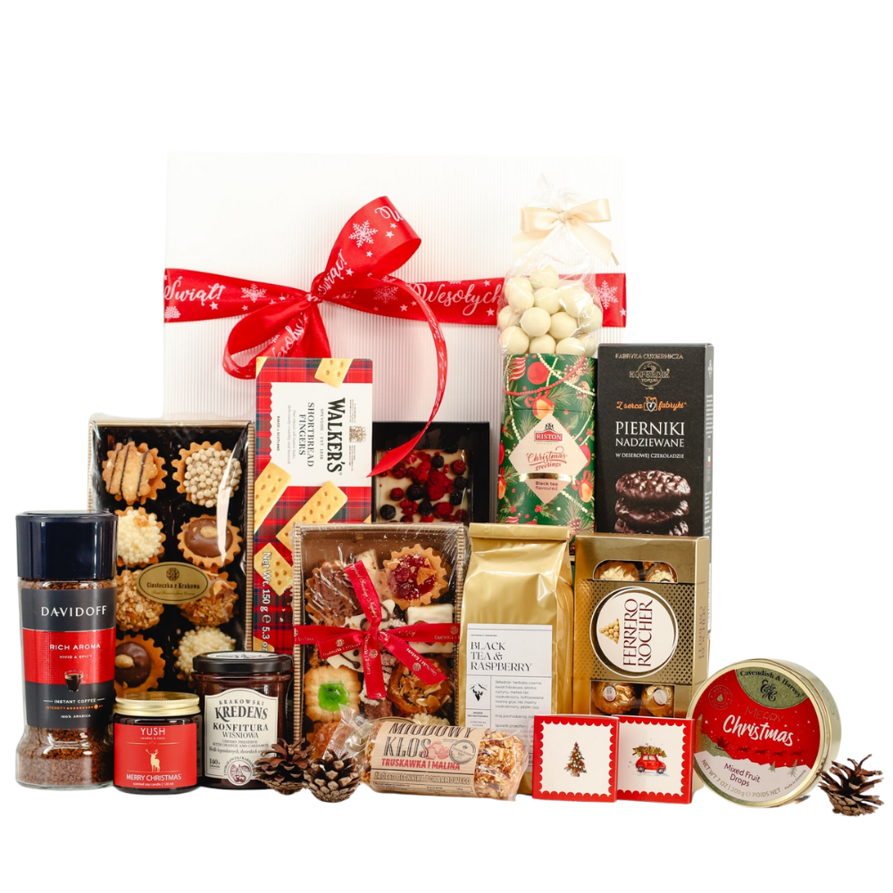 W zestawie znajdziesz: Kawa, Herbata, Cukierki, Świeca, Bakalie, Czekolada, Ciastka, Praliny i Konfitury