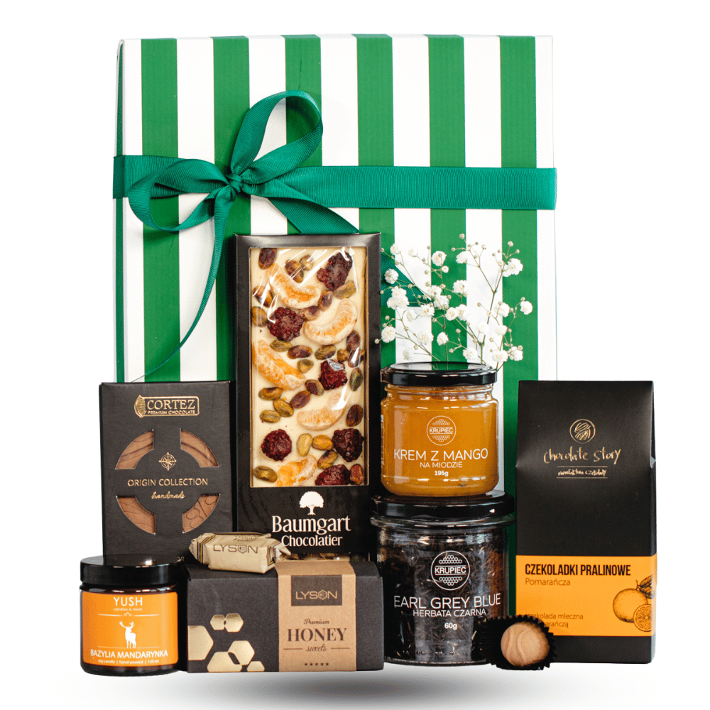 Ekskluzywny zestaw prezentowy z kremem z mango, miodowymi krówkami, białą czekoladą z owocami, pralinami pomarańczowymi, wyrazistą ciemną czekoladą, herbatą Earl Grey oraz sojową świecą o zapachu bazylii i mandarynki. Całość zapakowana w elegancki kartonik z ozdobną wstążką, idealny na wyjątkowe okazje.