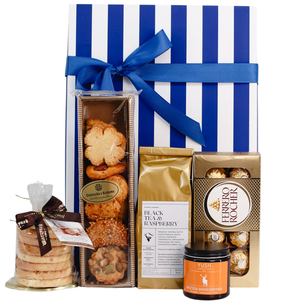 Nastrojowy zestaw prezentowy z relaksującą herbatą liściastą, kruchymi ciasteczkami w tuneliku Ciasteczka z Krakowa, pralinkami Ferrero Rocher, delikatnymi ciastkami owsianymi Wierzynek oraz sojową świecą o zapachu bazylii i mandarynki. Eleganckie opakowanie czyni go idealnym na wyjątkowe okazje.